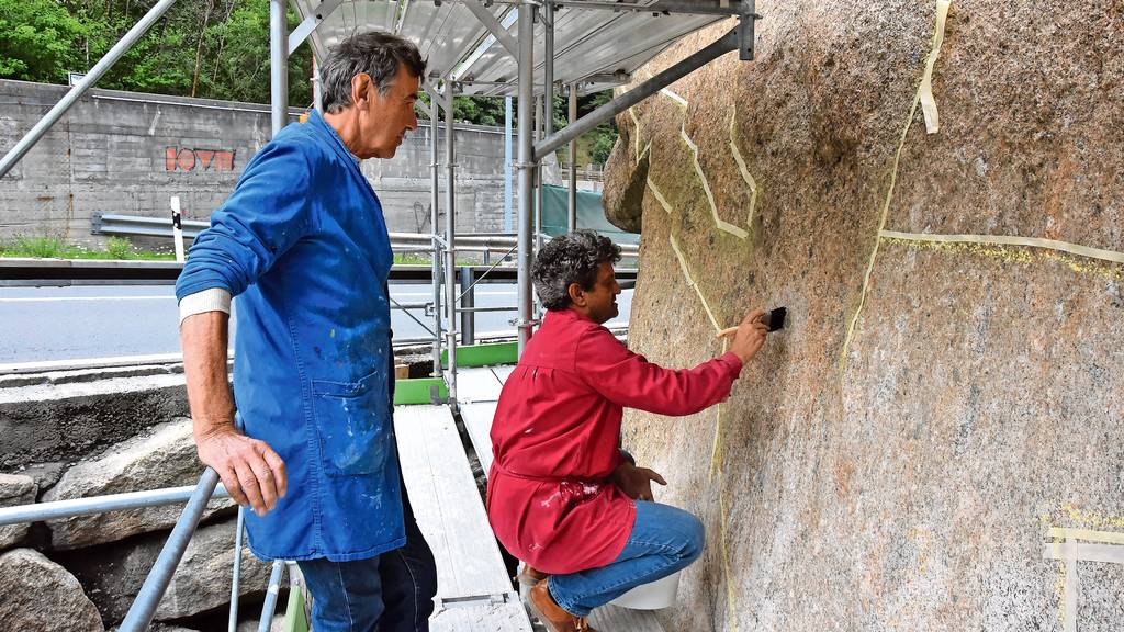 Zum Jubiläumsjahr des Urner Malers Franz Fedier entstand am Teufelsstein in Göschenen der gelbe Teufel nach einer Skizze des Künstlers. Im Frühjahr wird das Bild wieder entfernt.