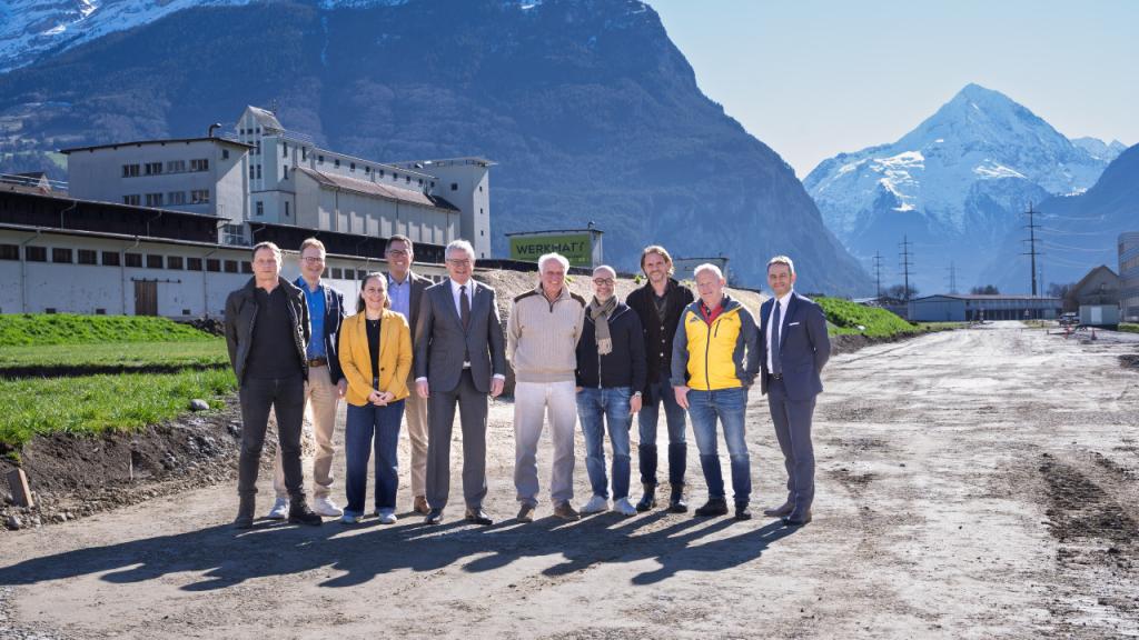 2/2 - Gruppenbild auf Baufeld – IG, Investor und Kanton Uri (v.l.n.r. Ady Bissig, Bissig Immobilien AG; Mario Epp, Vorsteher Amt für Wirtschaft und öffentlichen Verkehr; Evelin Walker, Projektleiterin Standortförderung; Claudio Deplazes, Provisio AG; Urban Camenzind, Regierungsrat und Volkswirtschaftsdirektor; Marcus Weber, Risa Immobilien SA; Martino Epp, Conea AG; Stefan Vonlanthen, àite AG; Stefan Arnold, Bauleitung und Dr. iur. Matthias Inderkum, Notar.