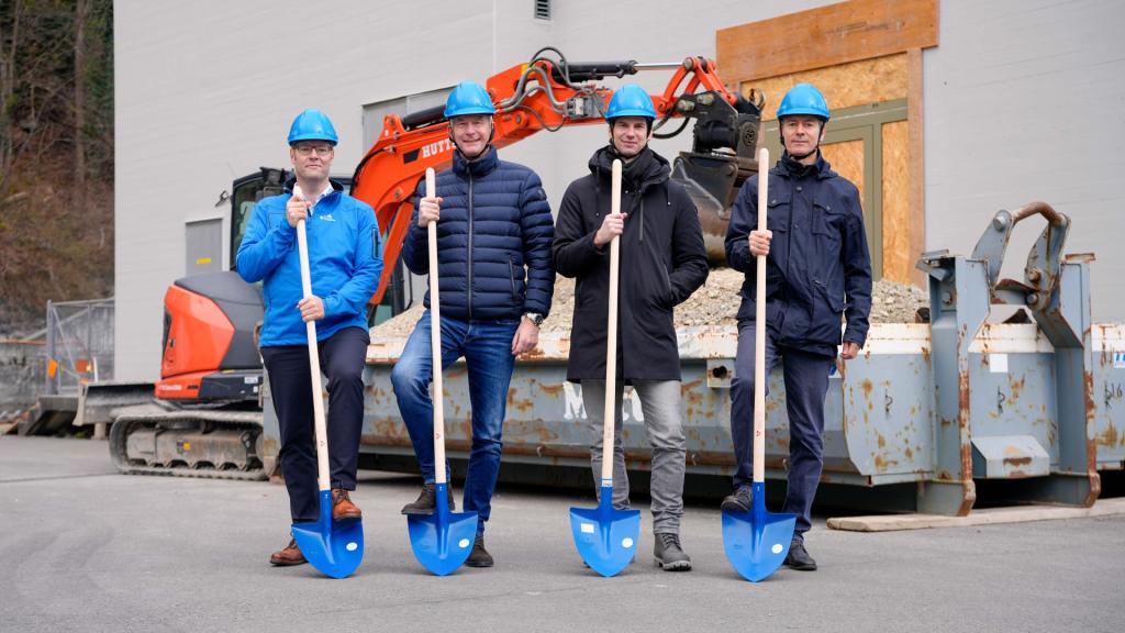 Vertreter der Aktionäre anlässlich des Spatenstichs. Von links: Werner Jauch (CEO EWA-energieUri AG), Alexander Streitzig (Mitglied der Geschäftsleitung Schätzle AG), Michael Limacher (Wasserstoff-Team Axpo), Carlo Cirillo (Wasserstoff-Team Axpo).