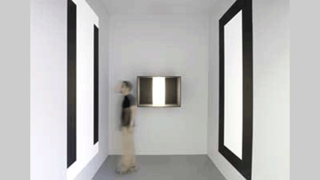 Gott in der BoxIm Zentrum seiner Abschlussarbeit steht Gott und die angesprochene Berührung mit dem Übernatürlichen. «The Godhead» heisst die dreiteilige Raum/Licht-Installation und vereint Gott, Jesus und den Heiligen Geist. Die Dreifaltigkeit, hierzulande oft in alten, üppigen und figurativen Bildern zu sehen, wird von Reto Scheiber subtil, auf das Wesentliche reduziert, wiedergegeben. Gott wird als viereckige schwarze Box, mit einem Lichtstrahl durch die Mitte dargestellt. Jesus ist ein 250 auf 150 Zentimeter grosses Wandgemälde mit schwarzem Rand auf weissem Hintergrund. Der Heilige Geist zwei vertikale schwarze Balken auf weissem Hintergrund. Alle drei Werke sind in einem hellgrauen Raum sich gegenüber aufgestellt.