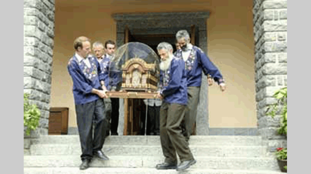 Zurück nach LisieuxEher einen längeren Weg traten anschliessend die Reliquien der Heiligen an. Sechs starke Spirgner Männer in «Sännächuttäli» haben den Schrein der heiligen Thérèse von Lisieux zu einem vor der Kirche wartenden Kleinbus getragen. Bereits am Nachmittag wurde die heilige Missionarin Thérèse in Oberurnen und anschliessend in Cazis erwartet. Die unter der Schirmherrschaft von Diözesanbischof Vitus Huonder stehende Reliquientour findet dann morgen, 15. Juni, mit der Rückkehr nach Lisieux ihren Abschluss.