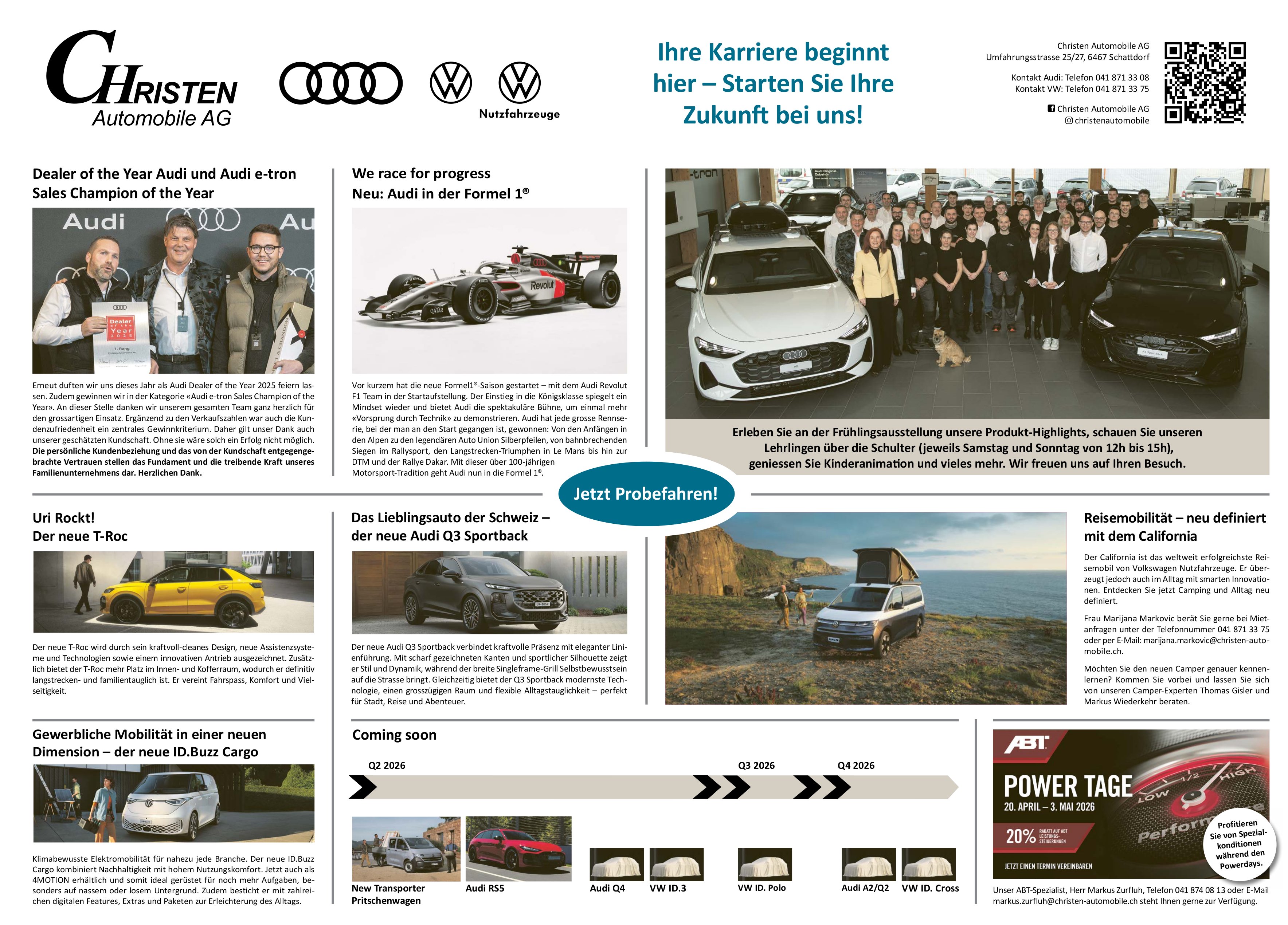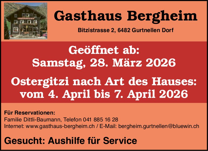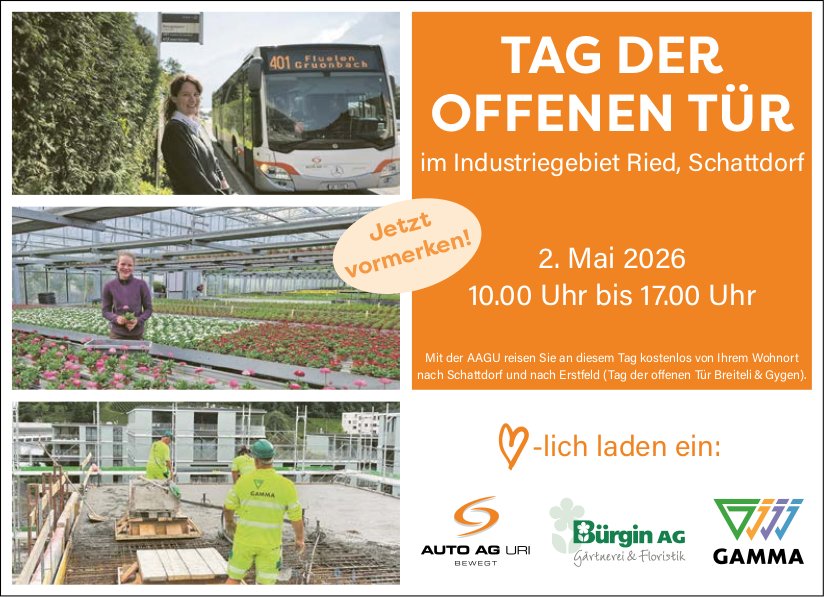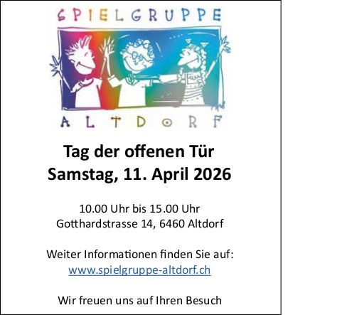 Egal ob Ihre Veranstaltung in Altdorf, Bürglen, Schattdorf, Andermatt oder in einer anderen Gemeinde stattfindet, die Urnerinnen und Urner wissen Bescheid. Mit Ihrem Eintrag erreichen Sie die ganze Leserschaft der Zeitung «Urner Wochenblatt», des Gratisanzeigers «Uristier» und online sind die Veranstaltungen für alle kostenlos abrufbar.