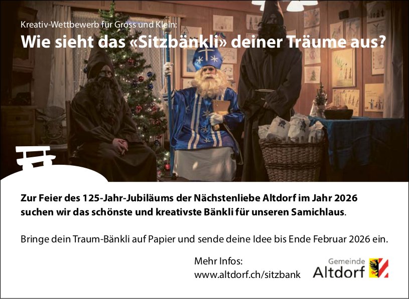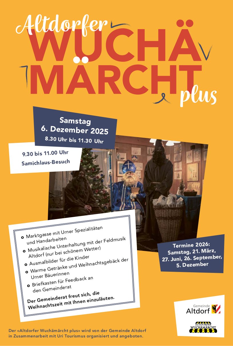 Egal ob Ihre Veranstaltung in Altdorf, Bürglen, Schattdorf, Andermatt oder in einer anderen Gemeinde stattfindet, die Urnerinnen und Urner wissen Bescheid. Mit Ihrem Eintrag erreichen Sie die ganze Leserschaft der Zeitung «Urner Wochenblatt», des Gratisanzeigers «Uristier» und online sind die Veranstaltungen für alle kostenlos abrufbar.